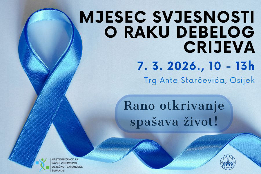 U subotu, 7. ožujka 2026. obilježit će se Mjesec svjesnosti o raku debelog crijeva na Trgu Ante Starčevića od 10 do 13 sati u organizaciji Nastavnog zavoda za javno zdravstvo Osječko-baranjske županije, Kliničkog bolničkog centra Osijek, Hrvatskog gastroenterološkog društva, Gradske lige protiv raka Osijek, Doma zdravlja Osječko-baranjske županije, Medicinskog centra Mursa, Medicinske škole Osijek, Invalidskog društva ILCO Osijek i CroMSIC-a Osijek pod pokroviteljstvom Grada Osijeka.